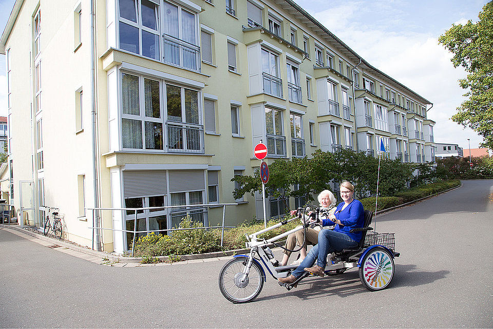 In unserem BRK-Wohn- und Pflegeheim "Am Staffelberg" gibt es eine Vielzahl von Angeboten für Menschen mit Demenz, welche dazu dienen, die Lebenssituation der Betroffenen zu verbessern. Besonders stolz sind wir darauf, dass unser Projekt "Erlebniswelten – Erfahrungsschatz erleben" vom Bayerischen Staatsministerium für Gesundheit und Pflege im Jahr 2018 mit dem bayerischen Demenzpreis ausgezeichnet wurde. Im Rahmen dieses Projekts fahren demenziell erkrankte Bewohner/innen unseres Wohn- und Pflegeheims gemeinsam mit Mitarbeitern/innen und ehrenamtlich Aktiven mit besonderen zweisitzigen Fahrrädern auf Wegen, die sie von früher kennen. Dies ruft Erinnerungen wach und ermöglicht den betroffenen Bewohnern/innen Teilhabe am öffentlichen Leben. Die körperliche Betätigung wirkt sich zugleich positiv aus.